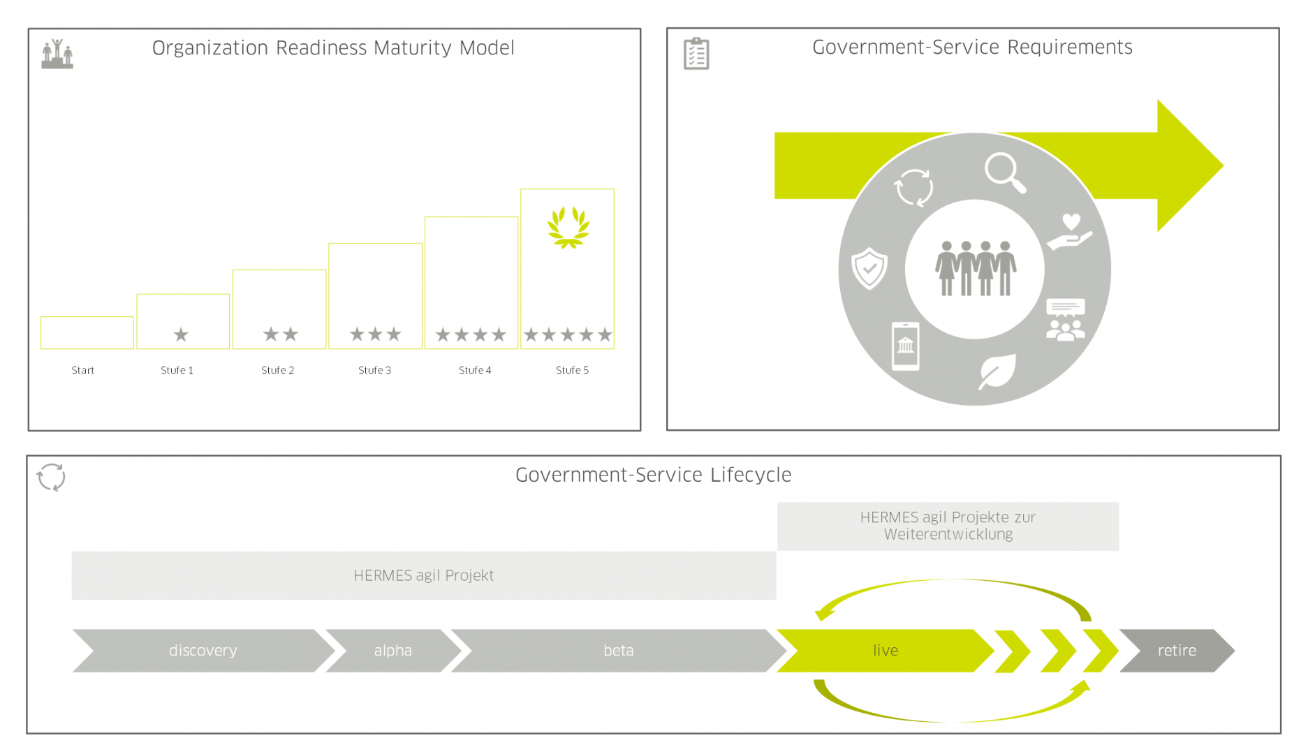 HERMES kompatibles, iteratives und leichtgewichtiges Vorgehensmodell, welches den gesamten Lebenszyklus eines Government Service umfasst.